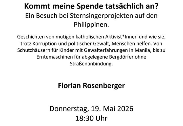 Dienstag, 19. Mai 2026 18:30 Kommt meine Spende tatsächlich an? Ein Besuch bei Sternsingerprojekten auf den Philippinen. Geschichten von mutigen katholischen Aktivist*Innen und wie sie, trotz Korruption und politischer Gewalt, Menschen helfen. Von [...]