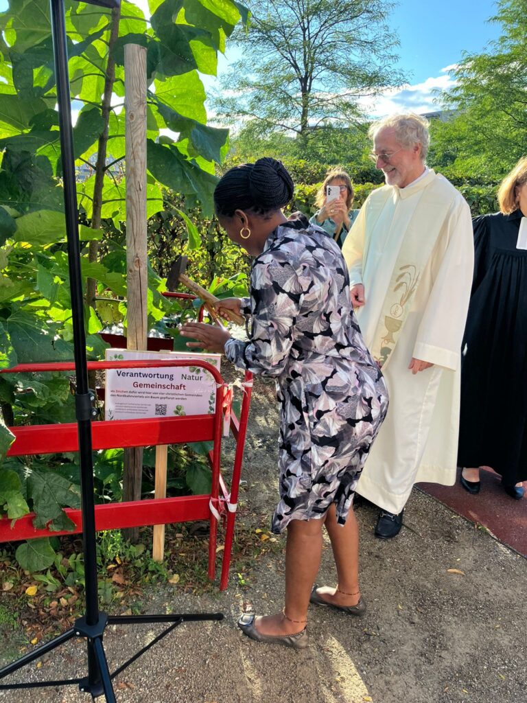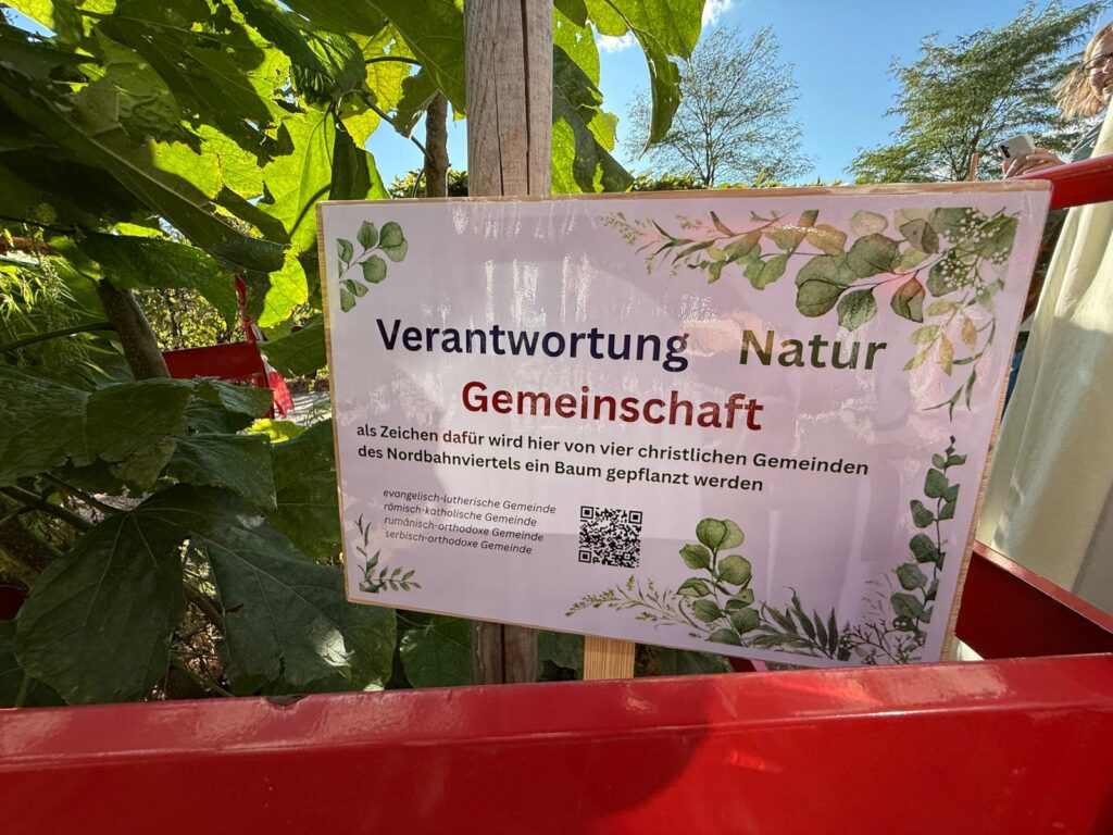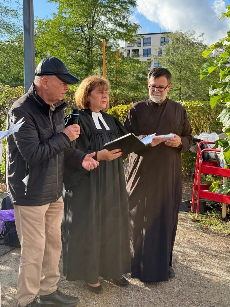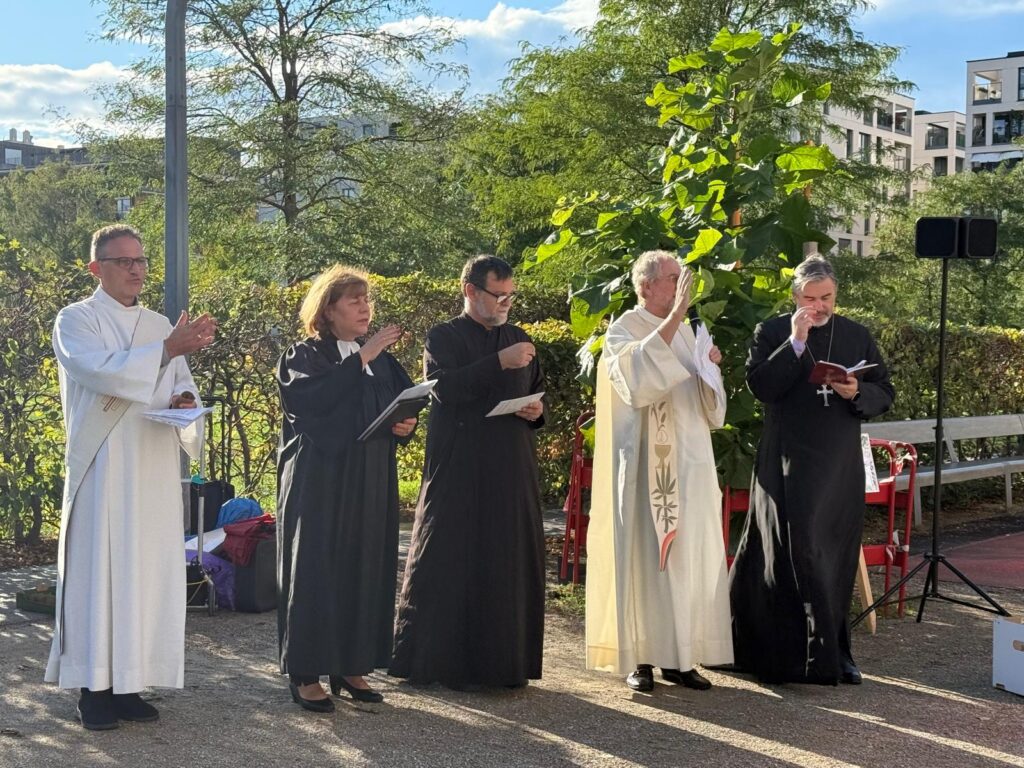 Vertreterinnen und Vertreter von vier christlichen Gemeinden dankten Gott für seine Schöpfung und setzten eine Tafel ein, bei der im November 2025 ein Baum gepflanzt werden wird.