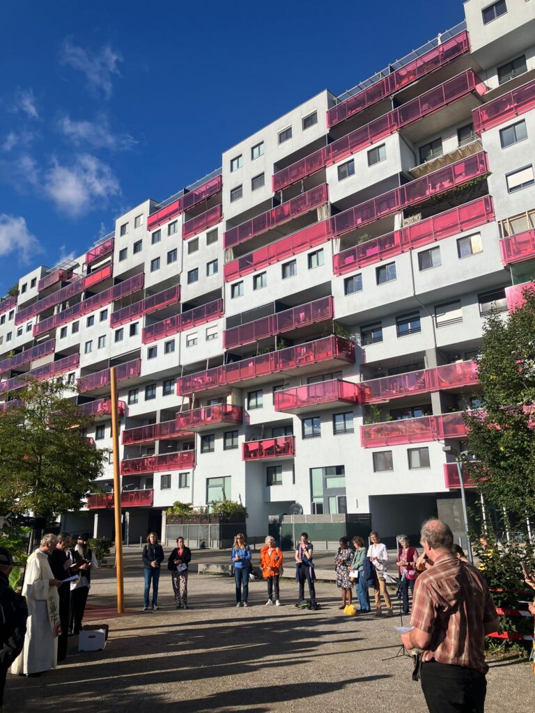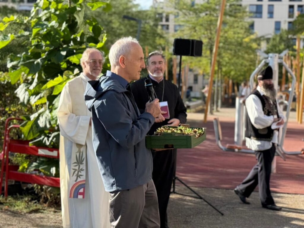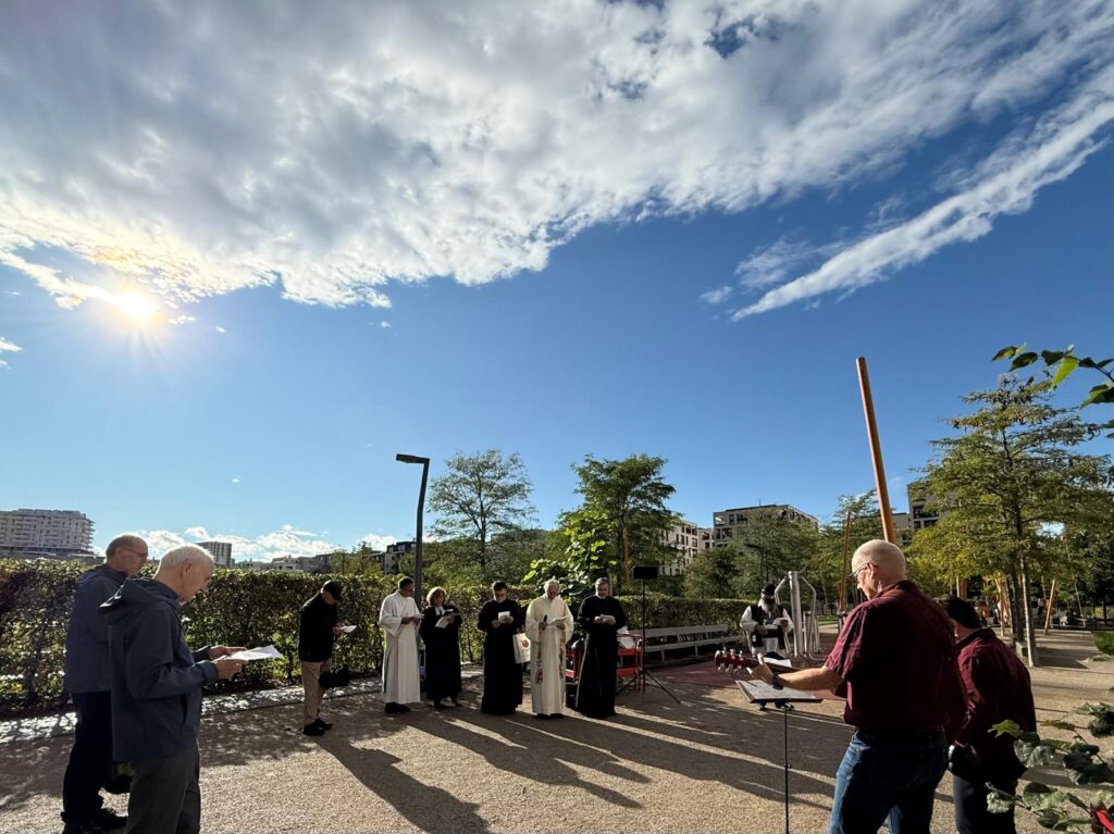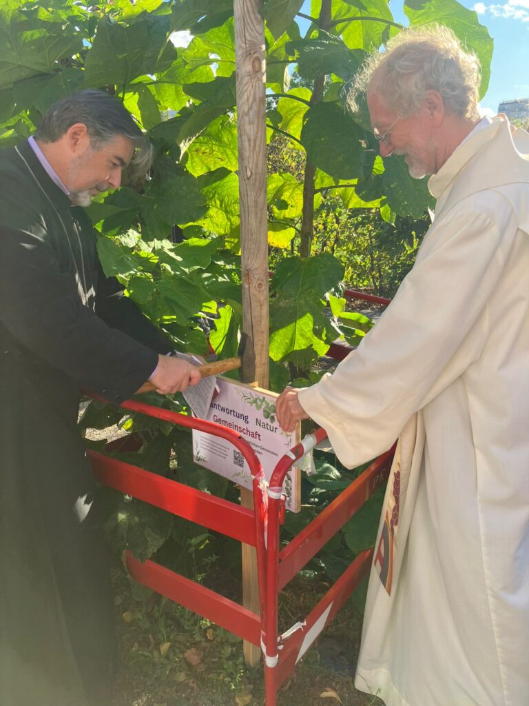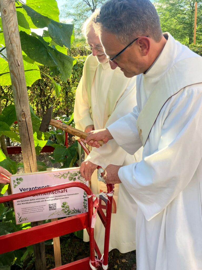 Vertreterinnen und Vertreter von vier christlichen Gemeinden dankten Gott für seine Schöpfung und setzten eine Tafel ein, bei der im November 2025 ein Baum gepflanzt werden wird.