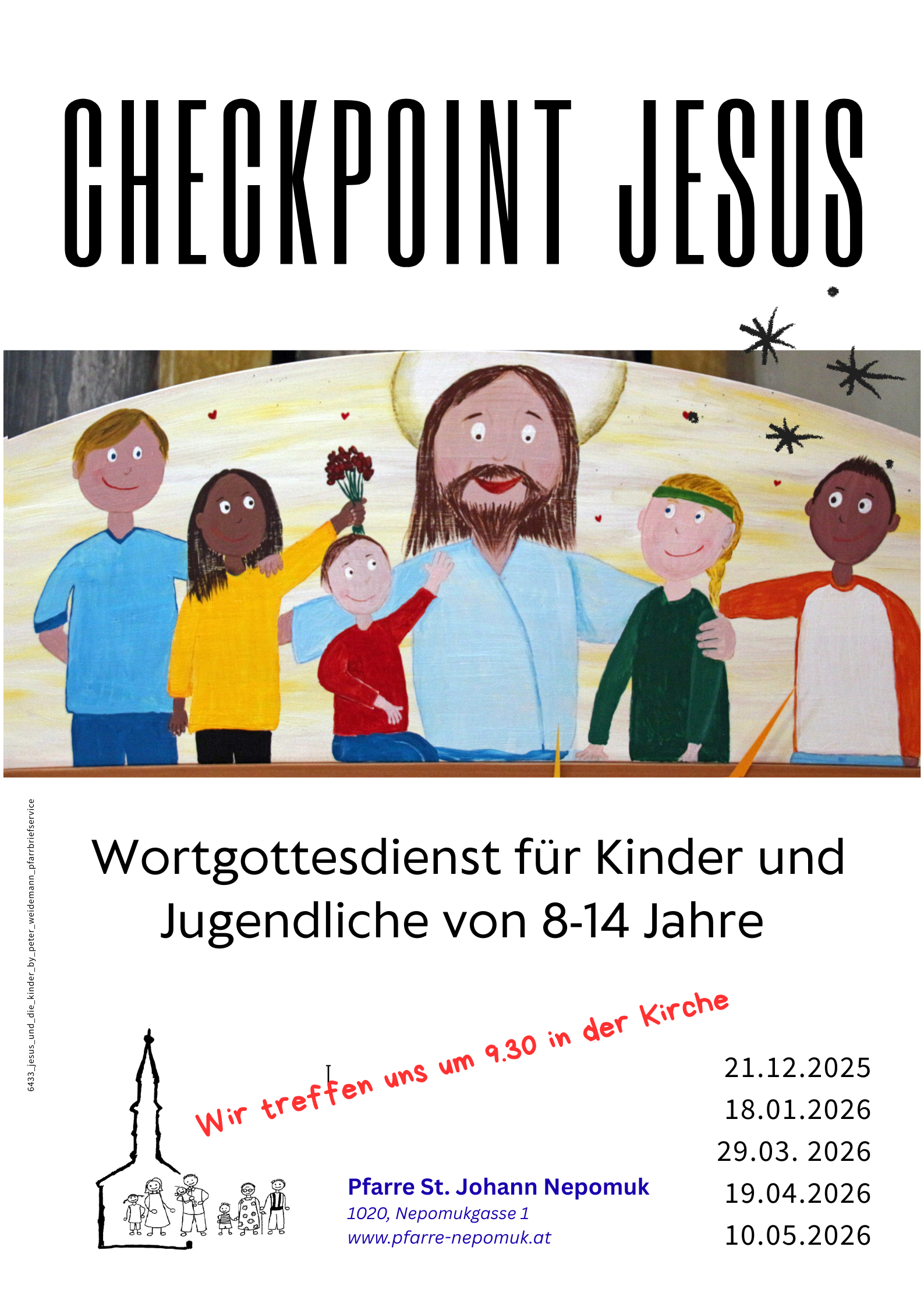 Wenn es einen Checkpoint-Jesus (= Wortgottesdienst für Kinder und Jugendliche) gibt, gehen wir mit Kindern und Jugendlichen von 8 bis 14 Jahre zum Wortgottesdienst in das Edith-Stein-Zimmer im Pfarrhof und hören das Evangelium, reden darüber und versuchen es zu be-greif-en.