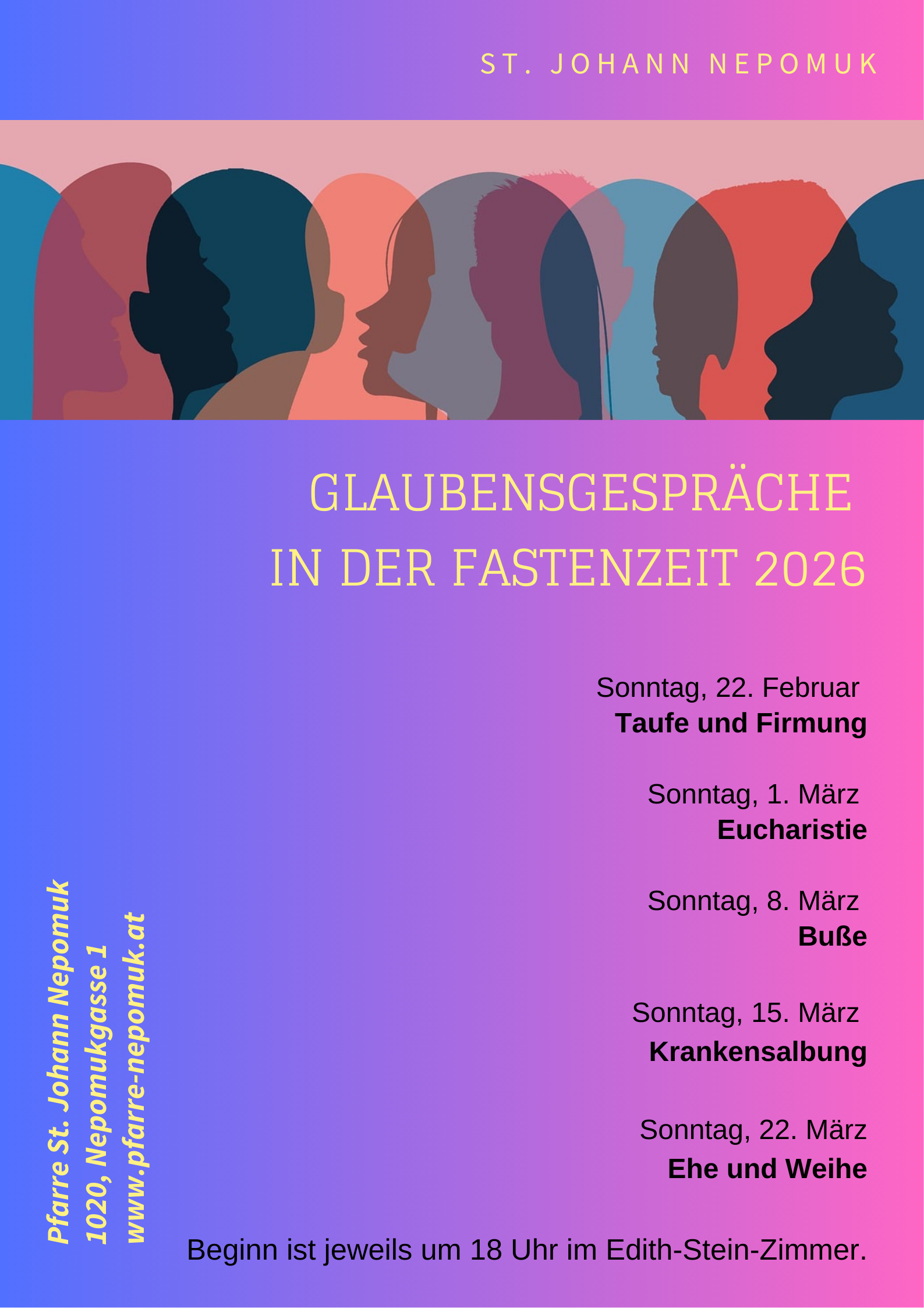 Jeweils vor den Sonntag-Abendmessen um 18 Uhr im Edith Stein-Zimmer (Pfarrhof, Erdgeschoß).