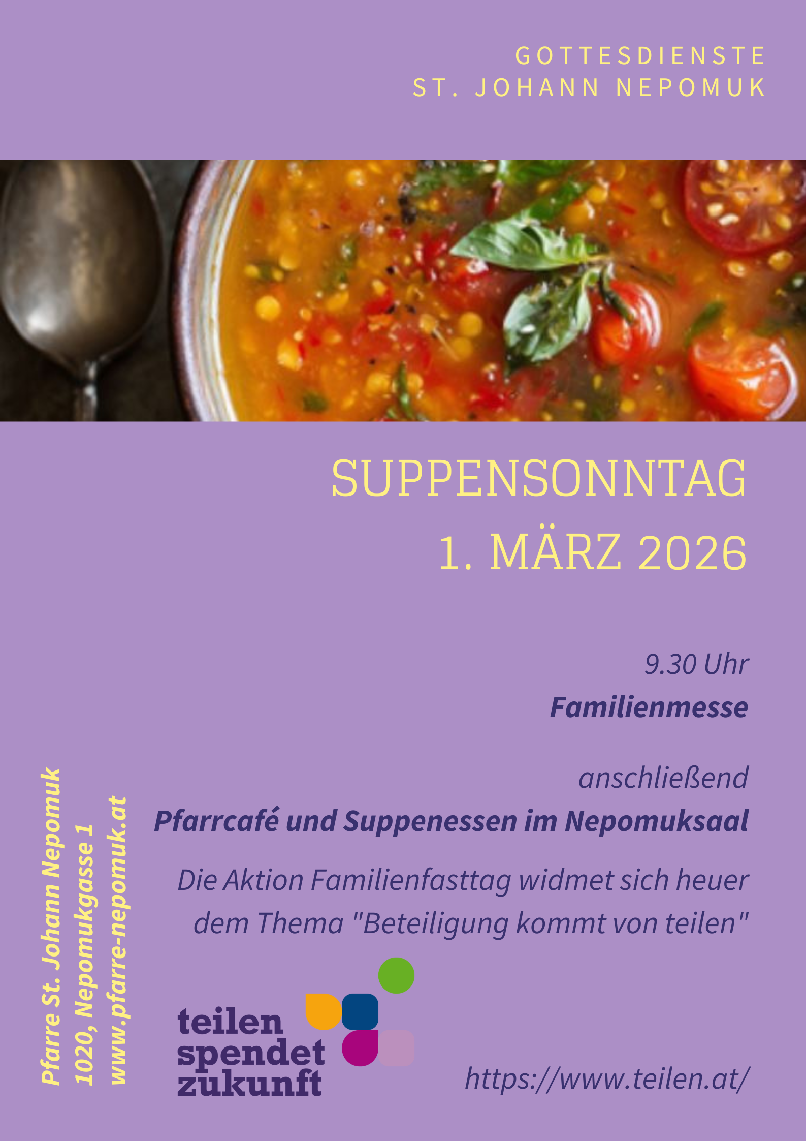 Anschließend laden wir herzlich zum Pfarrcafé und Suppenessen in den Nepomuksaal ein.