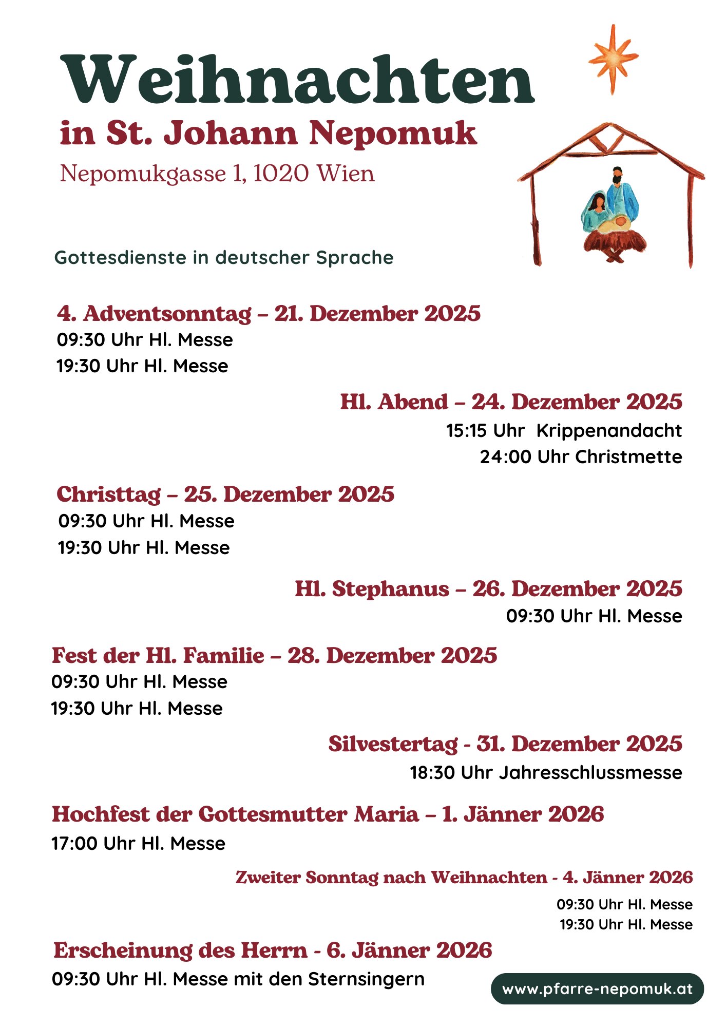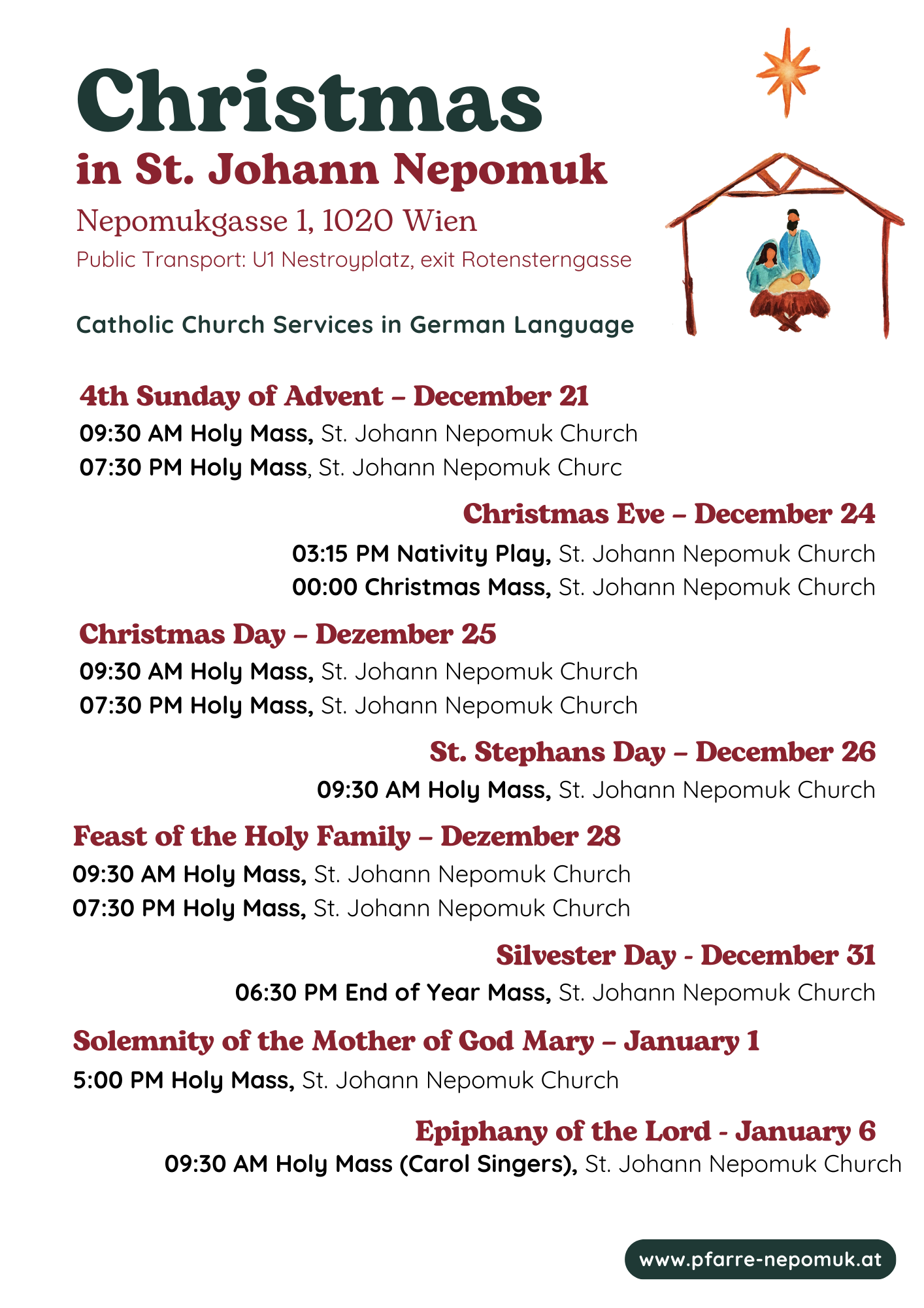 Here is a list with the Catholic Church Services until January 6th in St. Johann Nepomuk.